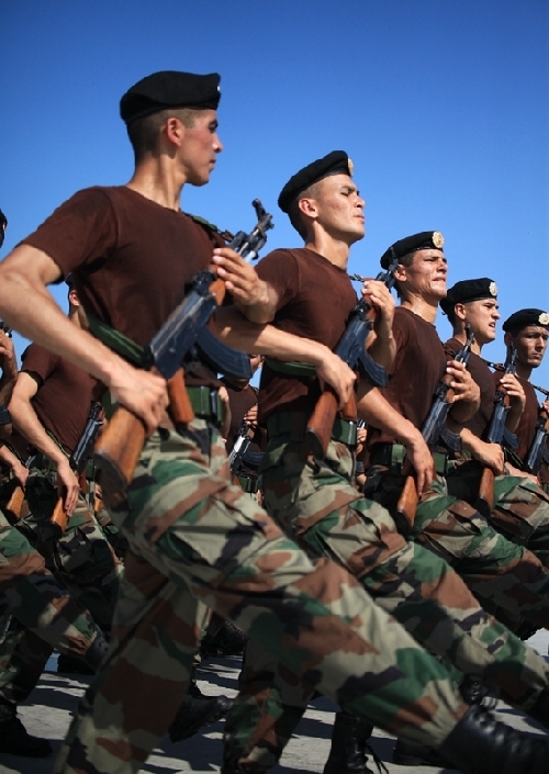 8月28日,塔吉克斯坦参阅方队在外军阅兵训练基地进行训练。新华社发(田丰 摄)