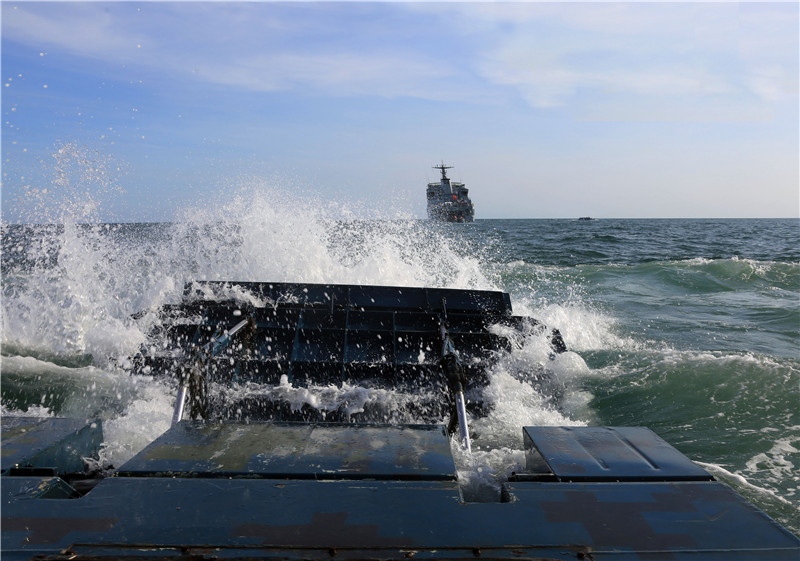 6月18日下午,海军陆战队某旅在登陆舰的配合下进行两栖装甲装备海上浮渡装卸载训练。