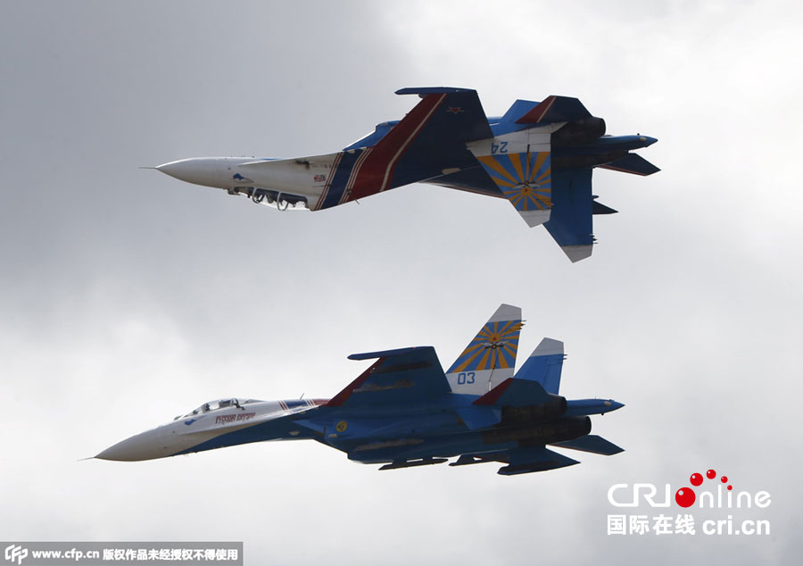 当地时间2015年8月30日,莫斯科国际航空航天展进入最后一天,特技飞行队空中炫技。图片来源:CFP
