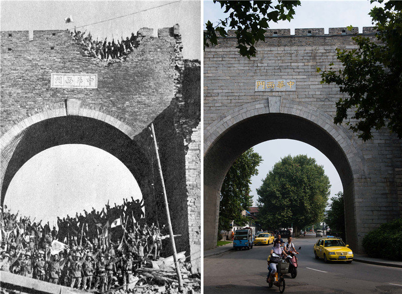 这张拼版照片的左图为1937年12月,日军登上中华门城堡中华西门(南京城墙保护管理中心提供),右图为行人和车辆从中华西门穿过(8月26日摄)。新华社记者 季春鹏摄