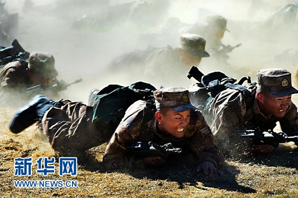 西藏军区岗巴边防营官兵在进行训练(2012年3月12日摄)。 新华社发(赵海波 摄)