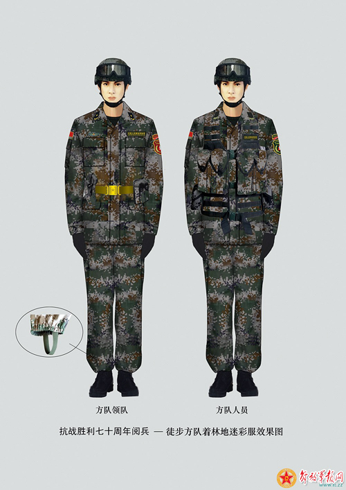 “林地迷彩、荒漠迷彩、海洋迷彩、多地形迷彩、二炮丛林迷彩、武警夏特战服、07式春秋常服……”9月3日,首都北京,三军将士身着崭新军服迈着整齐步伐接受习主席检阅。一时间,天安门前成了各类军服荟萃展示的大平台。尤其是多地形迷彩方队尤为引人注目,在不同光线、角度和背景下,该军服分别呈现出绿色、黄色和绿棕色等不同颜色。“提气,好看,神奇!”人们的赞美声不绝于耳。本网记者就此采访了总后军需装备研究所相关军服专家,详细了解多地形迷彩服的研究和设计情况,并获得胜利日大阅兵军服全系图片,以下是胜利日大阅兵军服的具体设计图样。颜值爆表,快来欣赏!