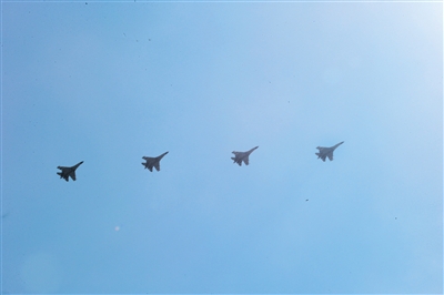 昨日,4架歼-11B战机组成编队飞过天安门广场上空。新京报首席记者 陈杰 摄
