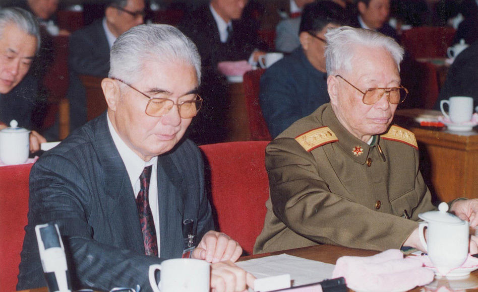 1993年3月26日,全国人大举行主席团会议通过人大各委员会候选人名单时,荣毅仁(左)和张震(右、中央军委副主席)按动表示键。