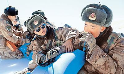 岗巴边防营官兵在巡逻途中吸氧(2014年1月27日摄)。赵海波摄