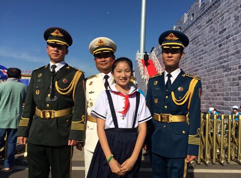 首次受邀参加“大阅兵”现场观礼的北京少先队代表李泓燕(人大附小)和三军仪仗队队员合影留念。