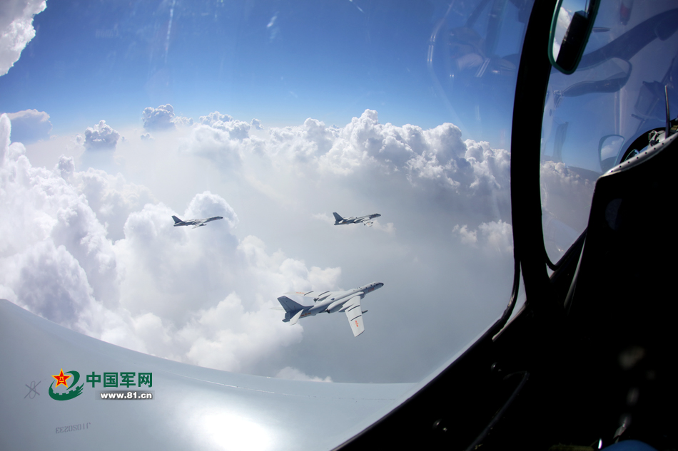 2015年8月15日,由广空航空兵某师组成的轰炸机梯队正在蓝天之上实施编队训练。中国军网记者
