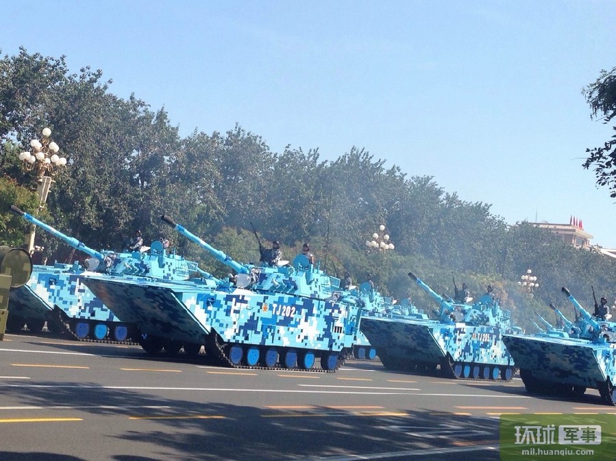 【环球军事报道】紧跟着99A型坦克方阵受阅的是05式两栖突击车,该突击车是我国最先进的05式两栖战车族威力最大的一个型号。该车以05式两栖战车底盘安装一部配备105毫米炮的炮塔,威力不小,是当今世界上水上速度最快,也是最先进的中型两栖突击车。