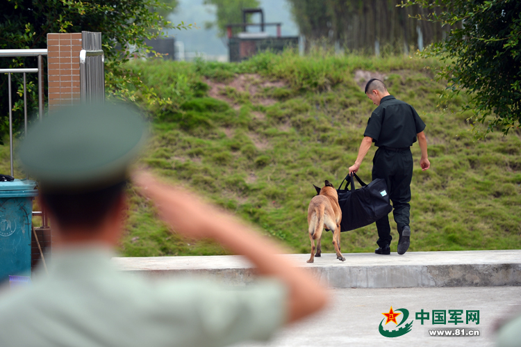 9月10日,武警重庆总队七支队特勤中队警犬班的训导员蒋治杰退役,在离开营区时,与他朝夕相处的警犬迪娜舍不得他离开部队,咬住行李不放,和蒋治杰亲吻惜别。当日,该总队千余名满服役期的老兵离开部队,安全返乡。