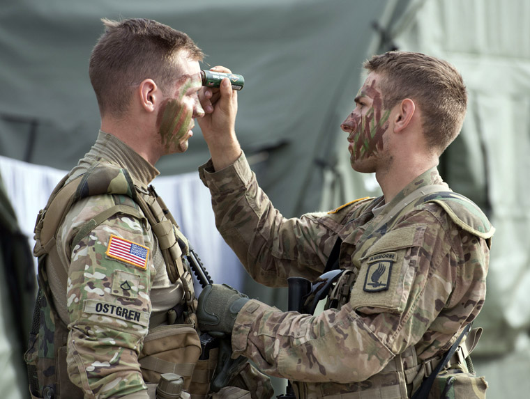 多国联合军事演习开放日 美士兵脸涂迷彩