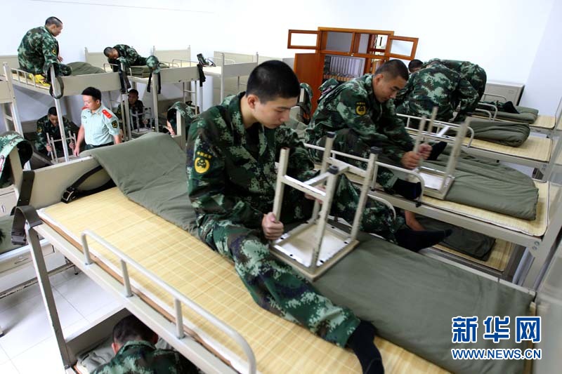 14日,浙江边防总队新兵团二连的新兵们在班长带领下苦练“磨被功”,他们利用椅子、茶杯和手掌不停地磨擦着被子上的皱纹,以便能让被子叠出象豆腐块一样。“磨被功”是新兵们警营生活的第一课,旨在培养他们严谨细致的作风和沉稳、踏实的性格。(郏策)