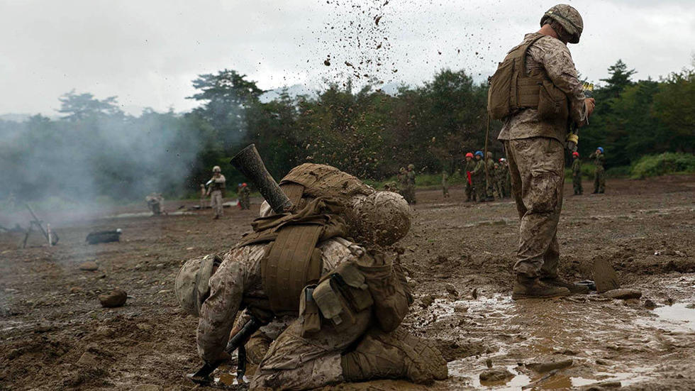 美日训练交流展示各自武器装备 士兵互相比着“打炮”