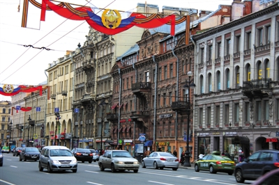 2015年5月圣彼得堡著名的涅瓦大街,上方装饰着庆典的条幅。图/东方IC