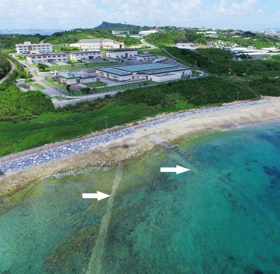 在网络流传的图片可看到,冲绳宇流麻市岸边(白色箭头所指)有两条日本海上自卫队海洋观测站延伸出去的海底电缆掩埋痕迹。