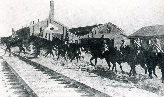 1931年11月19日,日本关东军攻占齐齐哈尔。与此同时,黑龙江大部分地区陷入敌手。图为关东军骑兵侵入齐齐哈尔火车站。
