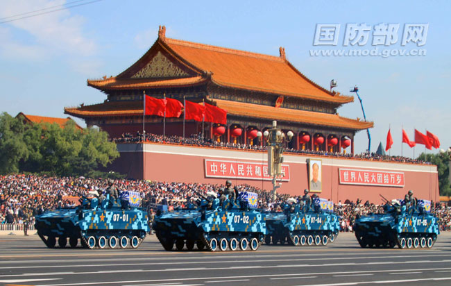 2009年国庆阅兵,空降兵战车方队通过天安门广场接受检阅。