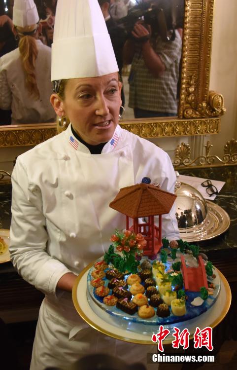 白宫首席甜点师莫里森展示为此次国宴准备的甜点。