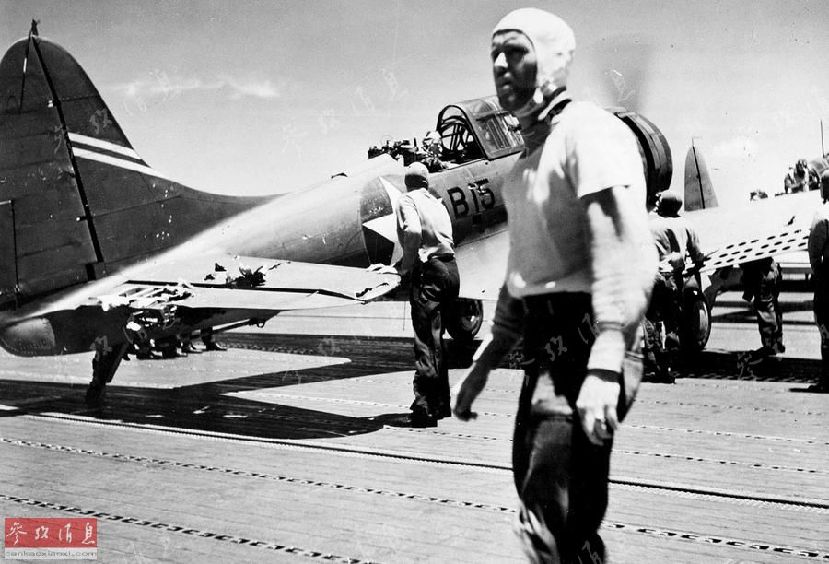 图为1942年6月4日,一架受损的SBD-3“无畏”俯冲轰炸机在“约克城”号航母上着陆,这架SBD隶属于第6舰载俯冲轰炸机中队,参与了轰炸日军“赤城”号航母的空袭行动。