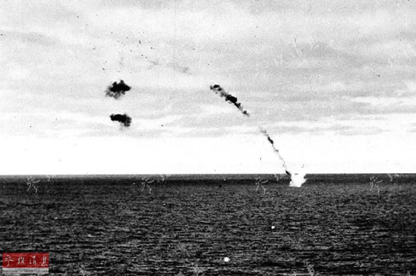 图为6月4日中午,摄影师从“约克城”号上拍摄的一架日军97“舰攻”鱼雷机被击落后,坠海。