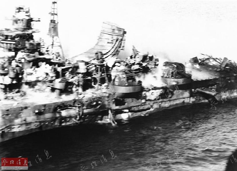图为美军侦察机低空抵近拍摄的已被重创的日军“三隈”号重巡洋舰,该舰在不久后沉没。