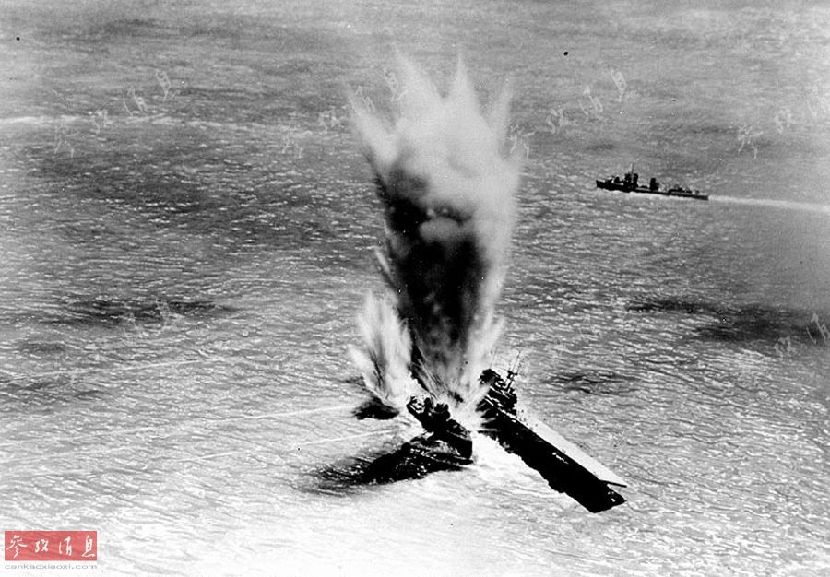 图为从美军战机上拍摄的“哈曼”号驱逐舰和“约克城”号航母被日军潜艇发射的93鱼雷命中瞬间。