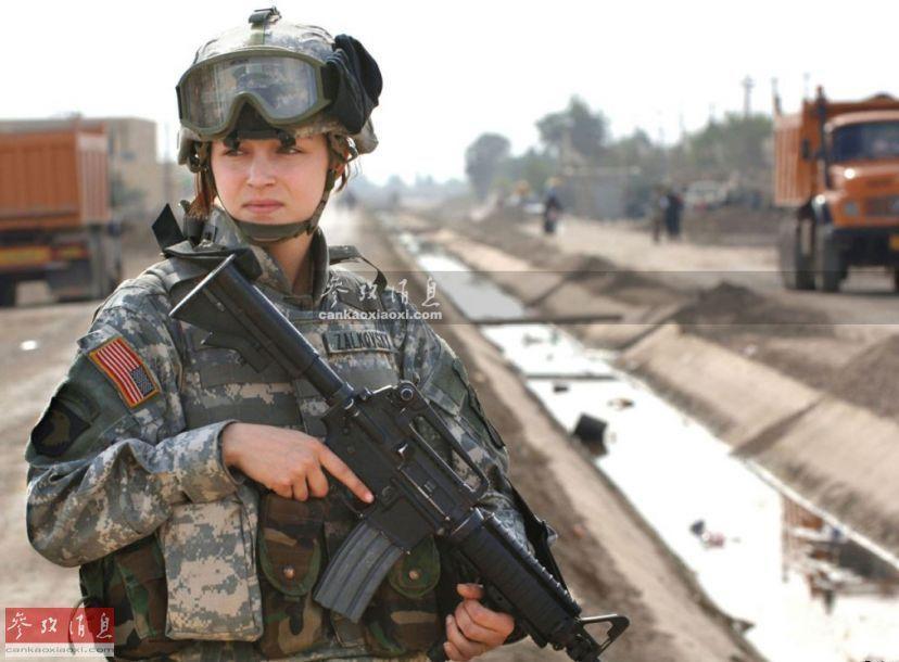 伊拉克战争期间,手持M4卡宾枪警戒的美军女兵。