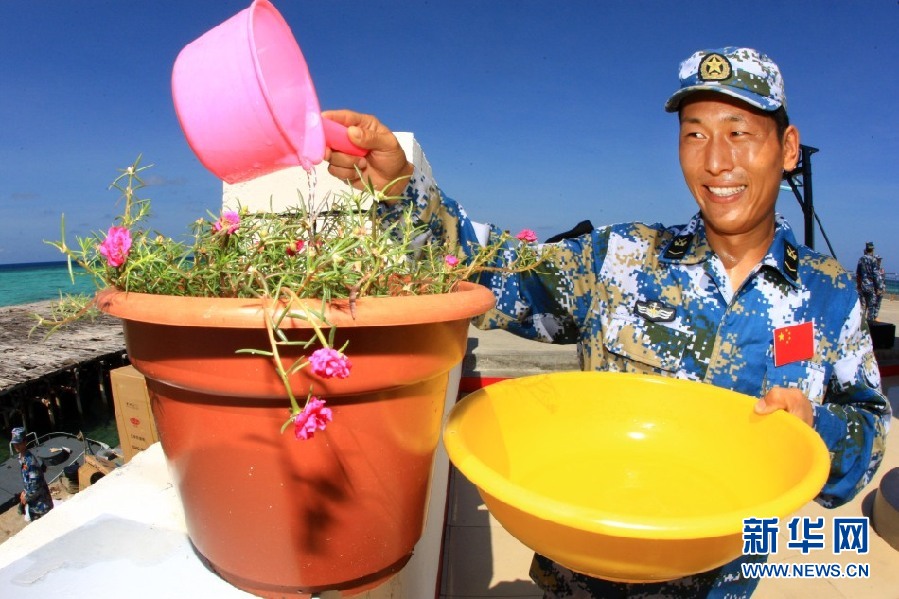 南沙东门礁的一名战士在为“太阳花”浇水。 新华社记者 查春明 摄