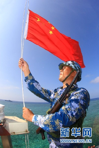 驻守在南沙渚碧礁的海军战士在礁堡上升起五星红旗。 新华社记者 查春明 摄