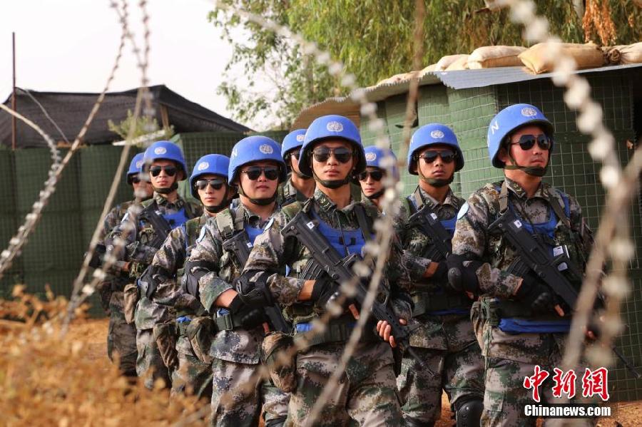 当地时间10月2日,中国第三批赴马里维和部队警卫分队在营区展开节日战备演练。图为维和部队警卫分队官兵在营区外围展开警戒巡逻。中新社记者 韩立建 摄