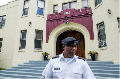 纽约军事学院的一名教师站在学校礼堂大厅前
