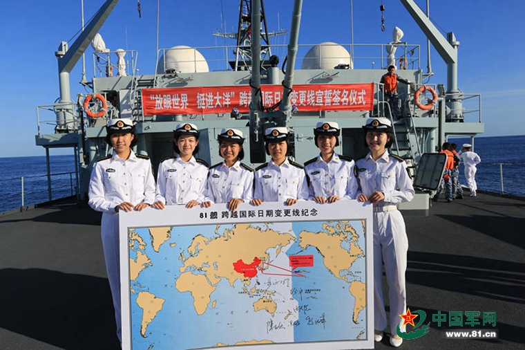 当地时间10月7日15时许,在西北太平洋海域,正在执行出海实习和出访任务的郑和舰,由西向东顺利跨越国际日期变更线。