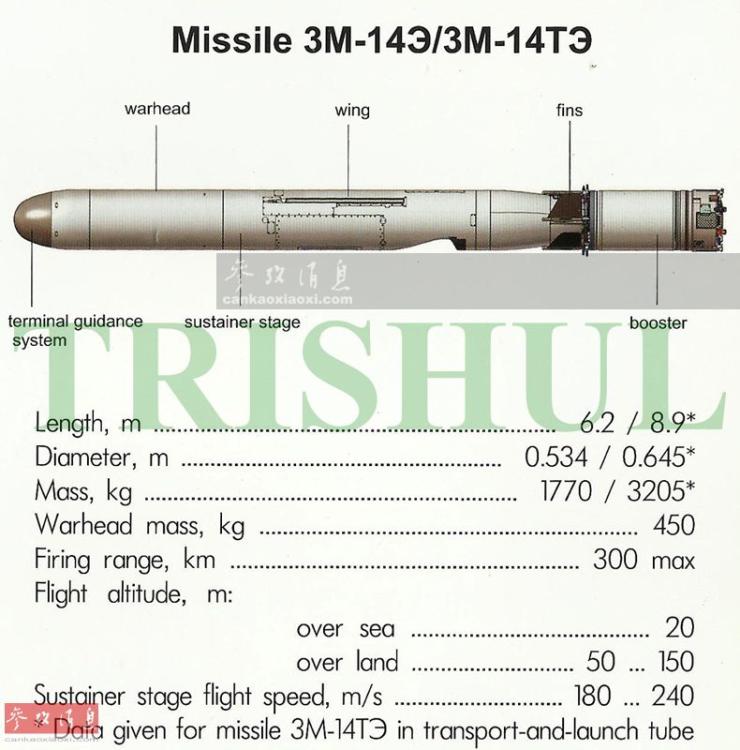 3M-14(俄语3K14)系列实际是“俱乐部”系列巡航/反舰导弹的对陆攻击派生型号。此前公布的型号有3M-14E和3M-14T,射程均为2500千米,最大飞行速度0.8马赫,可搭载450千克重的战斗部,采用惯性 格洛纳斯卫星制导。