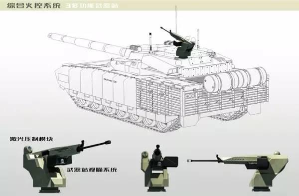 (3)多功能武器站 FAAS的多功能武器站安装在炮塔左后侧,武器站包括1挺12.7mm重机枪、1套独立观瞄系统和1套外挂主动激光压制模块。12.7mm机枪可替换成35mm榴弹机枪或其他类似武器。武器站的观瞄系统集成了简易热像仪、CCD、激光测距机等光学通道并有装甲保护的,必要时还可作为主炮的应急观瞄系统。外挂激光压制模块是重量和体积显著减小的新一代紧凑型激光压制系统,该系统的主光学镜组拥有独立的水平和高低伺服系统。 12.7mm武器站通过数据总线与综合火控系统交联,即可由综合火控系统自动控制,也可由车长或驾驶员手动操作。