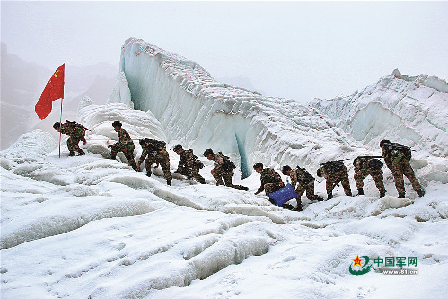 岗巴边防某连官兵巡逻在曲典尼玛冰川。刘友飞 摄