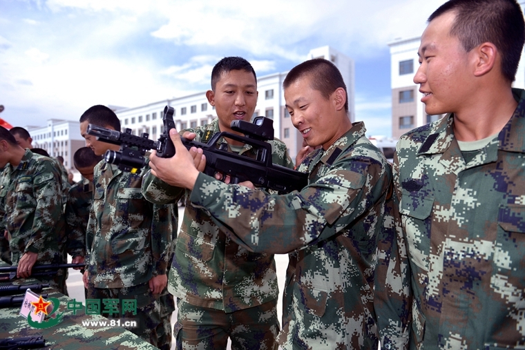 中队长常文龙在为新兵讲解红外全息瞄准镜使用。