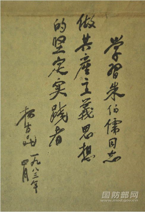 杨尚昆题词:“学习朱伯儒同志 做共产主义思想的坚定实践者”。(兵者摄)