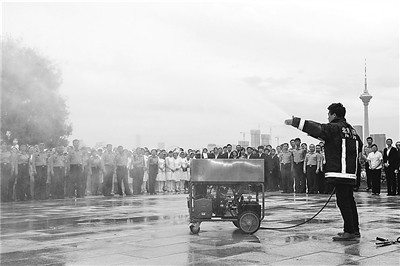 9月29日下午,由北京军区天津疗养院、周恩来邓颖超纪念馆联合主办,北京一家高科技公司全程参与的应急消防演练,让200余名军民现场见识了一种新型高科技灭火“神器”。它“个头”不大,灭火威力却相当于一台普通的10吨消防车,喷出的高压细水雾颗粒比头发丝还要细,灭火绿色安全,能在1000伏以下环境中进行带电作业。现场演示后,许多官兵兴致勃勃地向专业人员请教。(高晓杰、马雷、王燕敏)