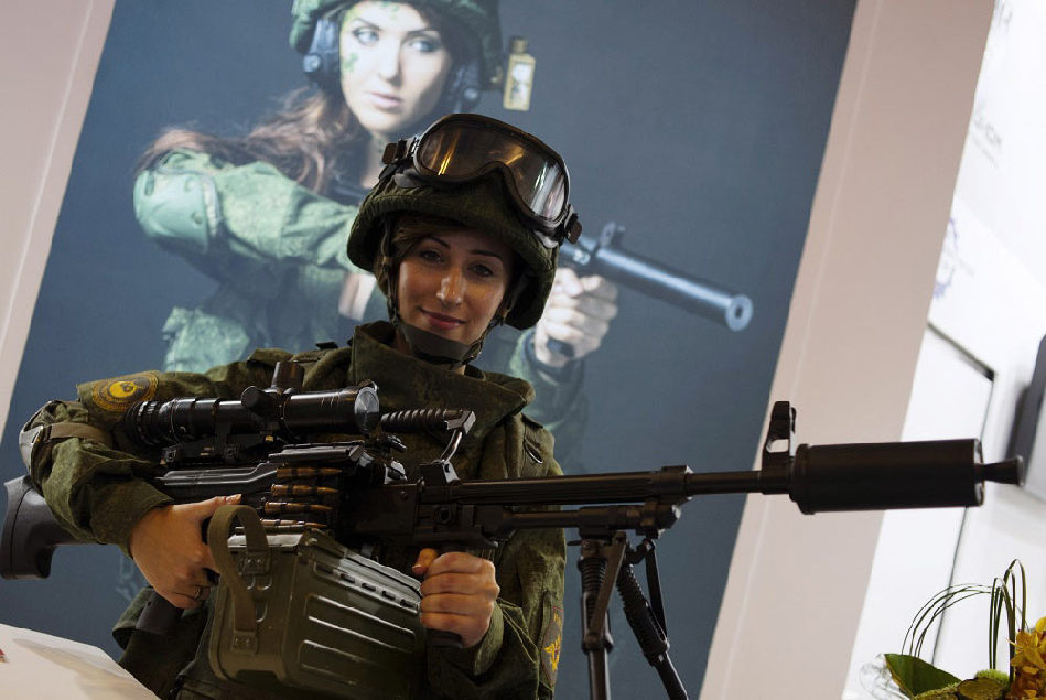 一位身着Ratnik装备的俄罗斯女兵。她手持新款PKM机枪,这款机枪拥有新式两脚架、瞄准镜、制退器、消音器,以及可调节折叠式枪托等。