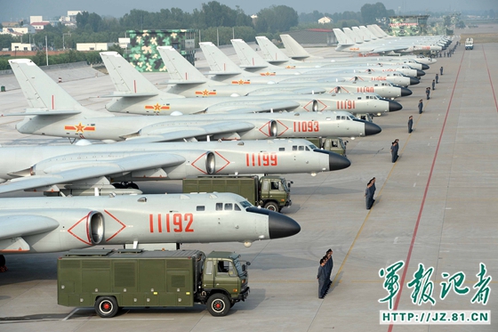 △纪念中国人民抗日战争暨世界反法西斯战争胜利70周年阅兵,轰-6K战机编队震撼亮相,接受祖国和人民检阅