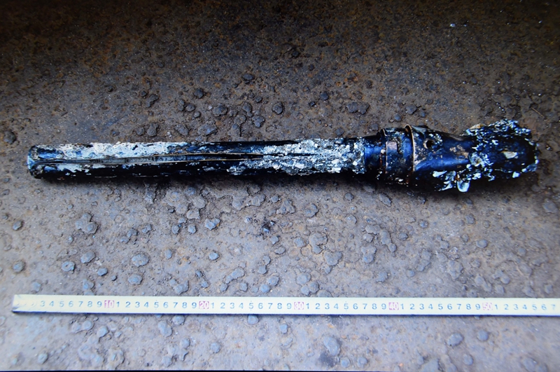 这艘战舰残骸的第一块钢板,是在2014年3月起吊出水的,当时笔者就在现场。这是一块带有翻卷创伤的锻制钢板。由于长期埋藏在水下泥土之中,保存十分完好。其上的双排大型铆钉孔清晰可见,其锻造的分层特点与北洋水师建军时期的典型造船工艺十分接近。这无疑使认定沉船身份的工作朝前走了一大步。