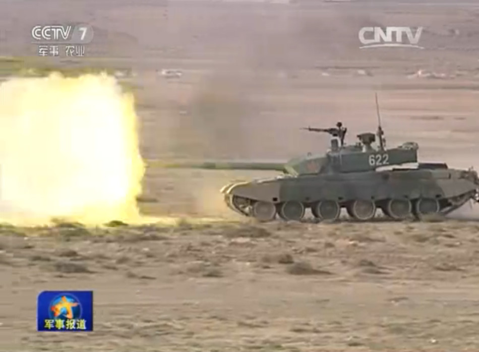 兰州军区重装99式主战坦克在青海高原上行进间射击。