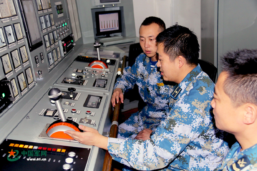 要成为一名舰艇值更官,首先要了解舰艇的心脏——动力装置。担负机电值更的学员需要在轰隆隆的发动机旁,在近百分贝的噪音和40多度的高温下为军舰“把脉”,掌握每一个仪表的参数和作用,检查设备是否安全运转。还要在集控室中操纵车舵,学会如何驾驭这条“海中蛟龙”。看那密密麻麻的仪表、按钮、操作杆,有木有“它认识你,你不是认识它”的感觉?瞬间感觉难度系数10.0有木有?