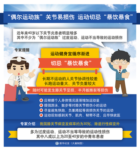 新华网天津10月15日电(记者黎昌政) 近年来40岁以下关节炎患者明显增多,其中不少为“偶尔运动族”过度运动、运动不当导致的运动损伤。专家近日提醒,运动健身宜循序渐进,切忌“暴饮暴食”。