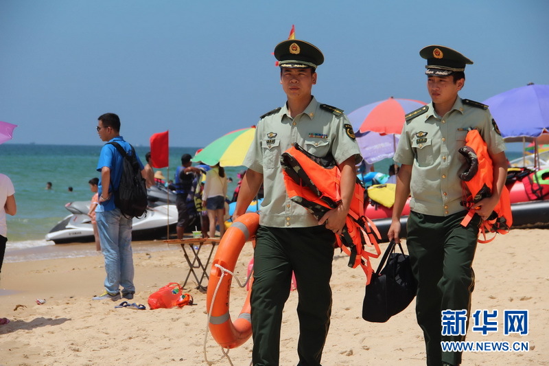 沙滩松软,踩在上面会陷出一个又一个的深脚印,走在上面要比走在坚硬的水泥路上困难得多。鞋子里容易渗进沙子,磨得脚掌生出水泡,巡逻民警索性脱掉鞋子,与温度可达50摄氏度白沙零距离接触。烈日挡不住游客们的热情,却晒黑了巡逻民警皮肤。警务室民警们一个个又黑又瘦,民警们戏言,无论多么顽固的肥肉都会随着汗水流失,无论多么白皙的皮肤在晒脱几层皮后总会变黑。