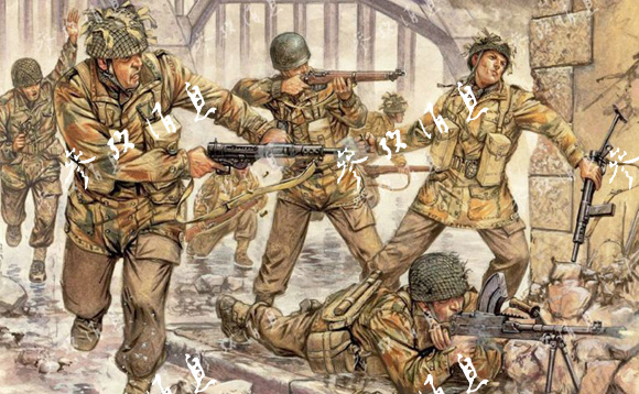 1944年9月发起阿纳姆空降战(注:“市场-花园”行动的一部分)时,盟军出动近3.6万名伞兵,空降距离大约480公里,乍看起来不是很远,使用美制C-47运输机从英国起飞往返完成一次物资空投只需4个小时左右。但问题在于,3.5万伞兵每天耗费至少1400吨军用物资,需要500多架C-47(注:载重2.7吨)运送。而实际上,由于天气恶劣、地空联络不畅,加之敌人猛烈反扑,盟军空降部队根本无法获得足够物资。特别是位于最前线的英军空降1师,苦战8昼夜却只得到所需补给品的15%。最终,该部伤亡6800人、被俘6000人,几乎全军覆没。图为描绘英军伞兵在阿纳姆大桥附近苦战的画作。