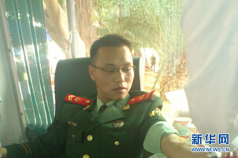 2013年9月13日,正准备休假的肖木腾突然接到了驻地中心血站的电话,一位患病女孩急需一个治疗量的机采血小板。来不及多想,他放下电话就立即打车赶到医院,献出了2个治疗量的血小板。