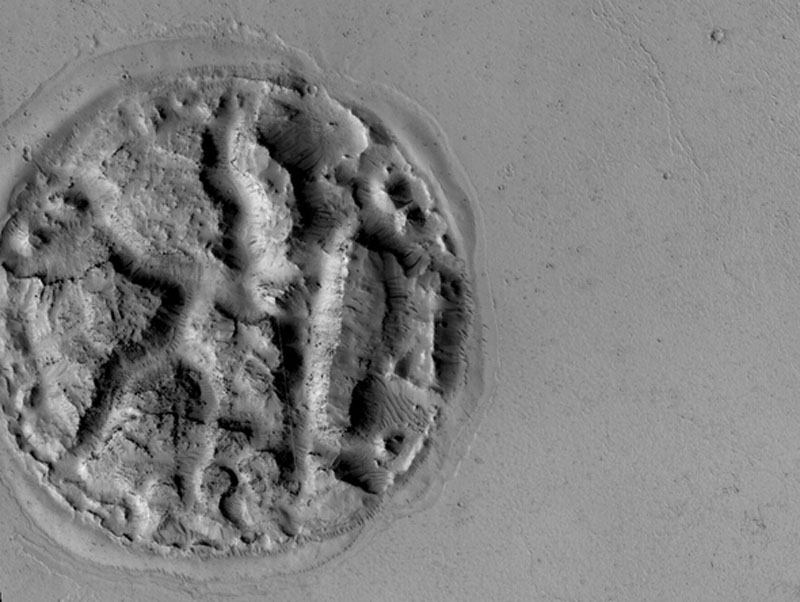 火星勘测轨道飞行器2014年末拍摄的照片显示,火星表面上有一个华夫饼形状的岛屿。这个岛屿直径约2公里,位于熔岩流区域,它可能是熔岩从上到下推动的结果。(网页截图)