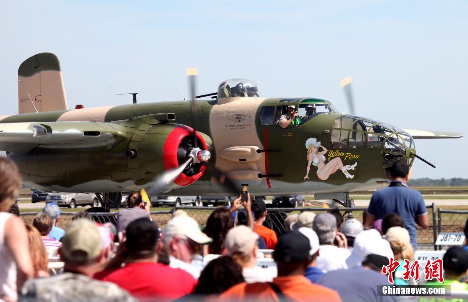 当地时间10月17日,第31届“天翼掠过休斯敦”航空展在美国第四大城市休斯敦的阿灵顿空军基地举行。多款美军现役和退役战斗机、运输机、直升机、美国宇航局大型运输机以及空军雷鸟飞行表演队等悉数参展。休斯敦航空与飞行博物馆还派出多架二战时期的老式飞机重现“日本偷袭珍珠港”战役。全球最大民用专业喷气机特技飞行表演队——百年灵喷气机队首次参展大秀空中特技,成为今年这一全球顶级航空领域展览的最大亮点。中新社记者 王欢 摄