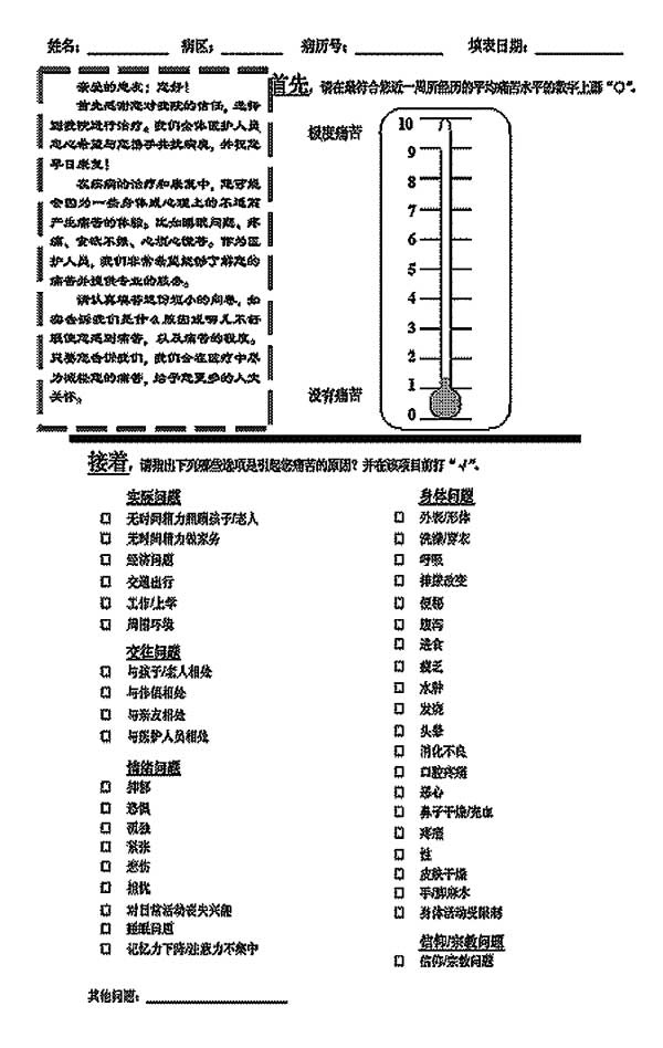 测量工具为医院焦虑量表和心理痛苦温度计与问题列表。医院焦虑抑郁量表为Zigmond 和 Snaith在1983年设计并使用的,是一检测效能较高的量表,用来识别和定量研究住院患者最普遍的精神心理障碍:焦虑和抑郁状况。心理痛苦温度计(DT)为NCCN为医师提供了评估心理痛苦的工具,此筛选工具为Roth 等发明并且广为应用。此心理痛苦量表被设计为一个温度计的形状,在其左侧标有0-10个分数等级,0分表示没有心理痛苦,10分表示极度心理痛苦。要求患者在0-10中圈一个数字来表示近一周(包括今天)的心理痛苦程度。问题列表(problem list, PL)为了检测患者心理痛苦的来源。涵盖了癌症患者将或已经遇到的各种问题:现实问题,家庭问题,情绪问题,精神信仰问题,身体上的问题。
