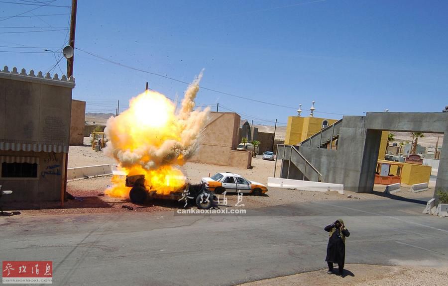 小城内模拟路边炸弹(IED)爆炸时的场面,美军训练的目的是,即将部署战区的部队经过这里的训练后,再进入真实环境时,面对类似场面就不会惊慌失措了。